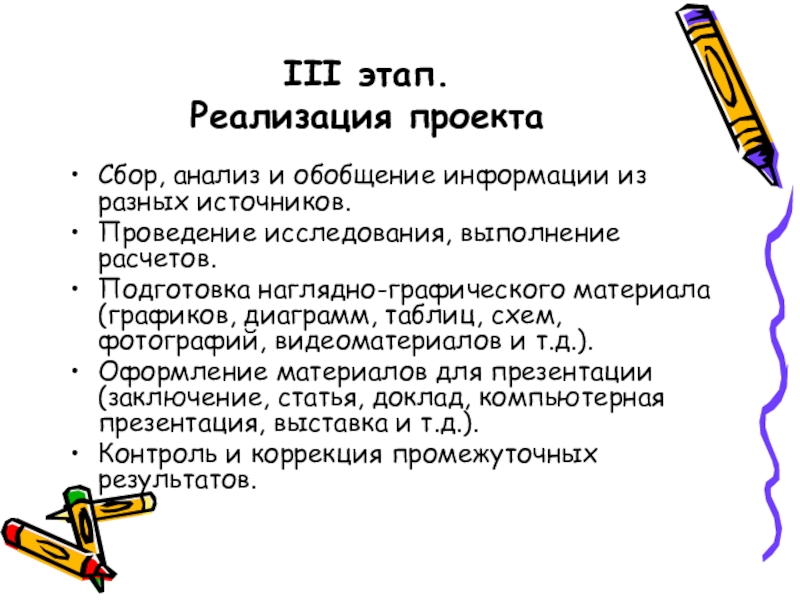 III этап. Реализация проектаСбор, анализ и обобщение информации из разных источников.Проведение исследования, выполнение расчетов.Подготовка наглядно-графического материала (графиков,
