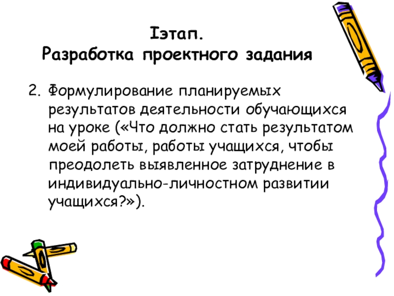 Iэтап.  Разработка проектного заданияФормулирование планируемых результатов деятельности обучающихся на уроке («Что должно стать результатом моей работы,