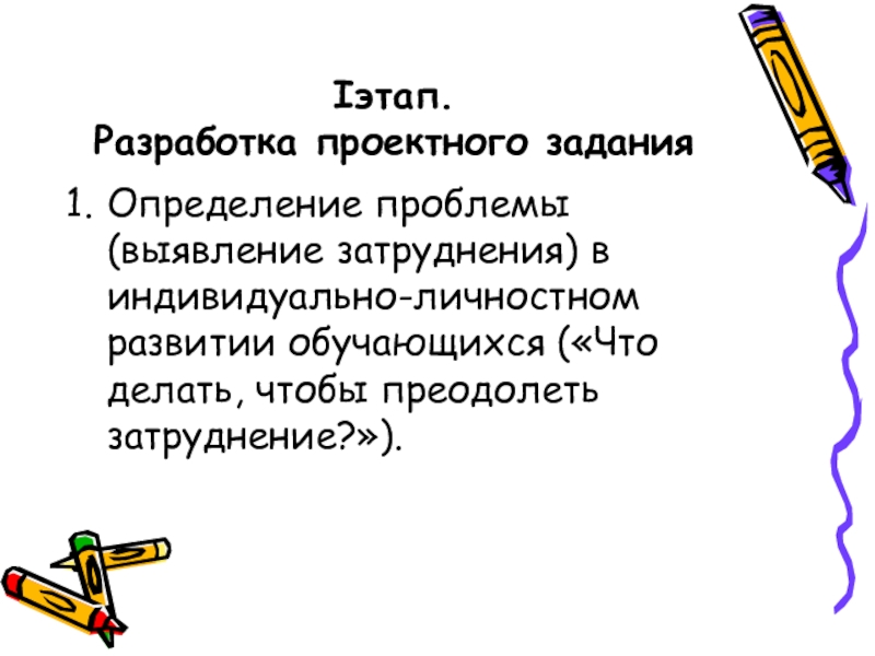 Iэтап.  Разработка проектного заданияОпределение проблемы (выявление затруднения) в индивидуально-личностном развитии обучающихся («Что делать, чтобы преодолеть затруднение?»).