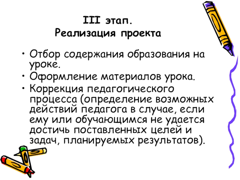 III этап. Реализация проектаОтбор содержания образования на уроке.Оформление материалов урока.Коррекция педагогического процесса (определение возможных действий педагога в