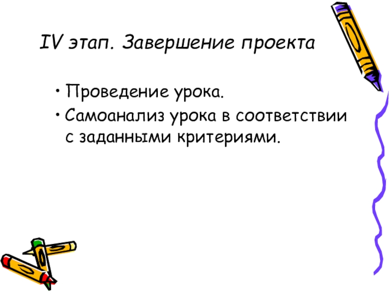 IV этап. Завершение проектаПроведение урока.Самоанализ урока в соответствии с заданными критериями.