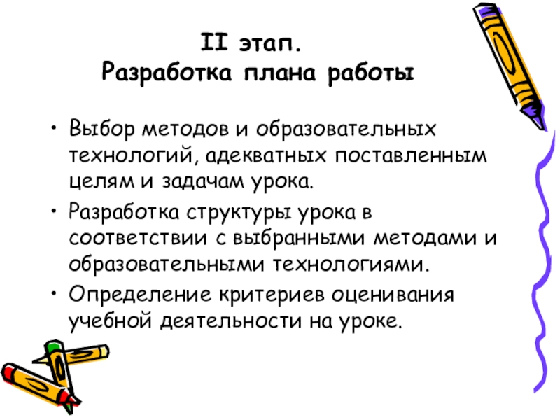 II этап.  Разработка плана работыВыбор методов и образовательных технологий, адекватных поставленным целям и задачам урока.Разработка структуры