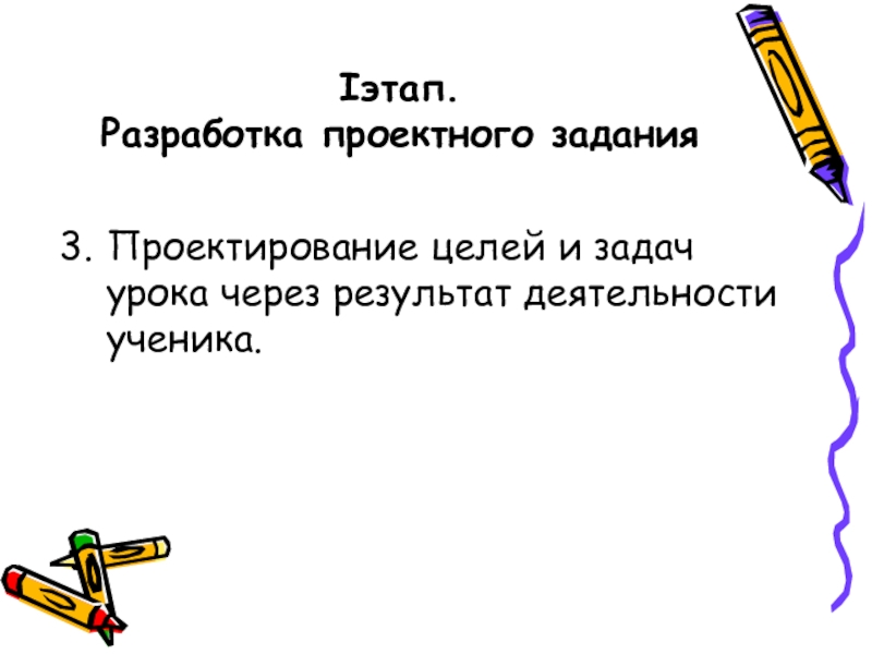 Iэтап.  Разработка проектного заданияПроектирование целей и задач урока через результат деятельности ученика.