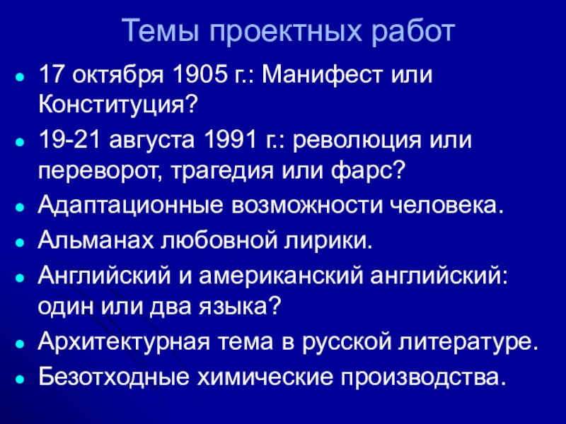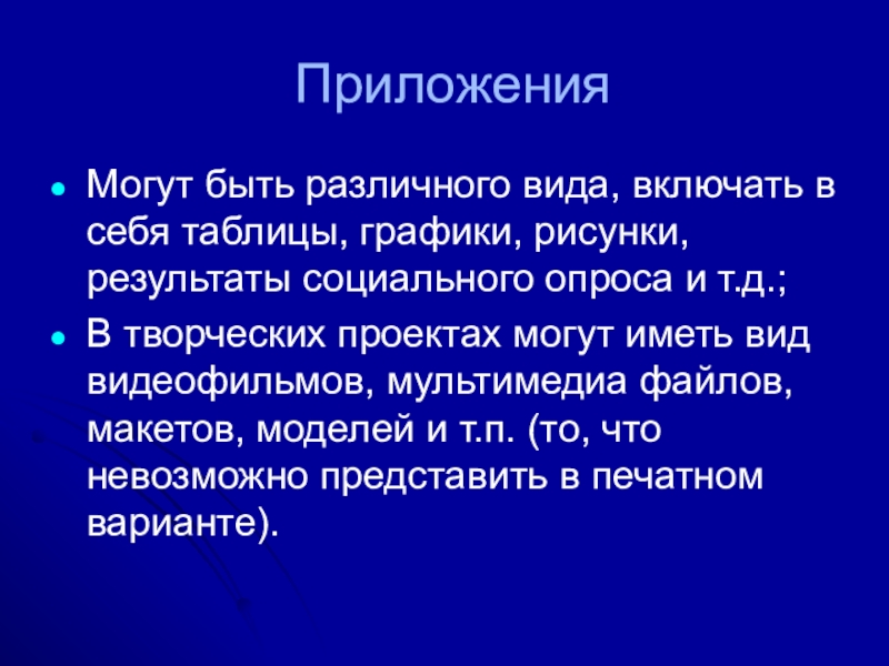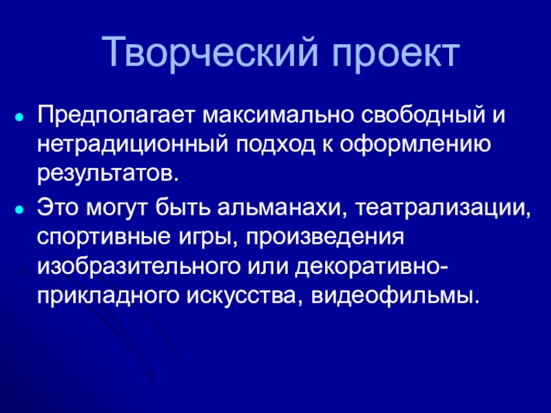 В творческих проектах могут иметь вид видеофильмов, мультимедиа файлов, макетов, моделей и т.п. (то, что невозможно представить в печатном варианте).