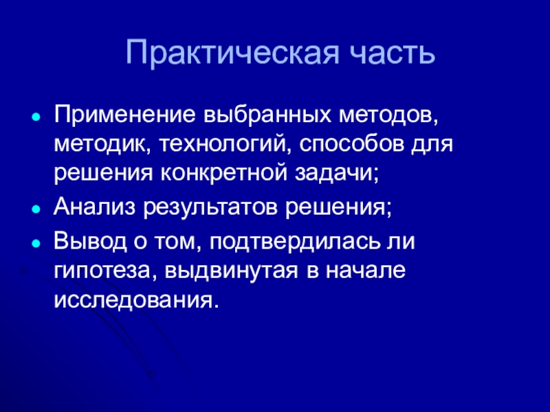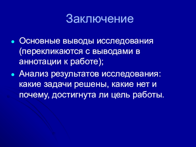 исследования: какие задачи решены, какие нет и почему, достигнута ли цель работы.
