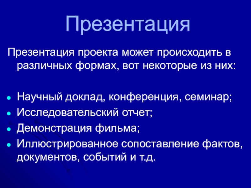 Презентация проекта может происходить в различных формах, вот некоторые из них: