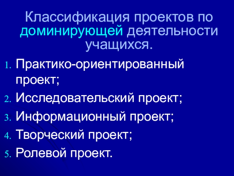 Слайд 4Классификация проектов по доминирующей деятельности учащихся.