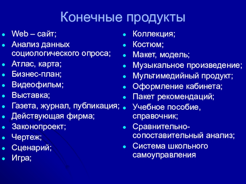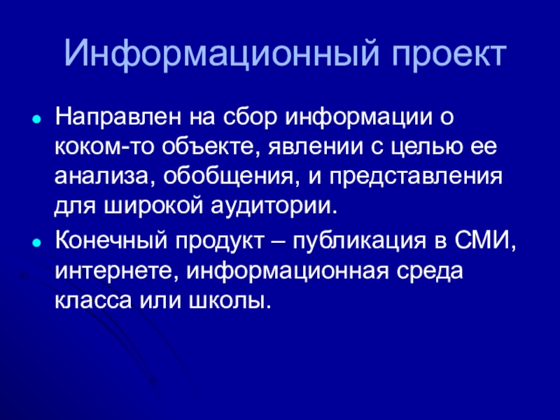Конечный продукт – публикация в СМИ, интернете, информационная среда класса или школы.