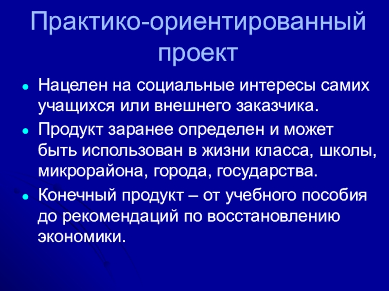 Нацелен на социальные интересы самих учащихся или внешнего заказчика.