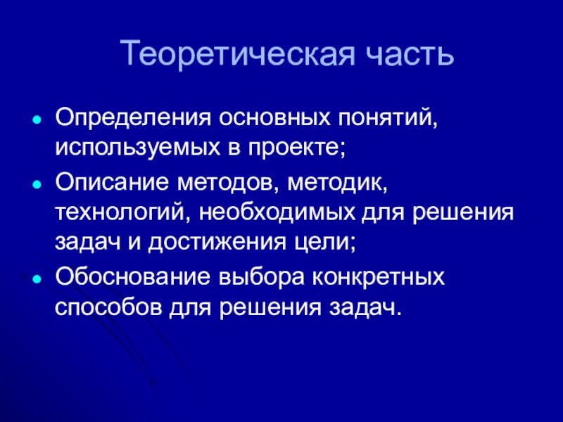 описанием теоретической части исследования, достаточно перечислить рассмотренные методы, и обоснование выбранного;