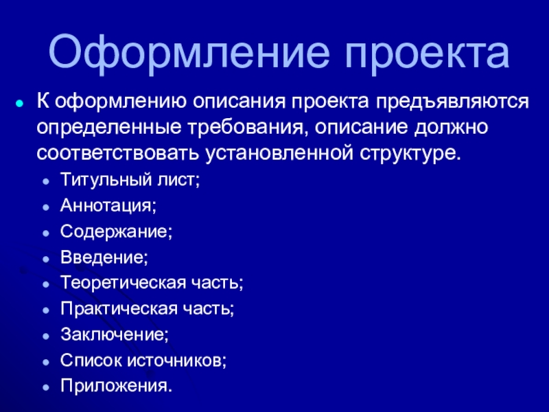 К оформлению описания проекта предъявляются определенные требования, описание должно соответствовать