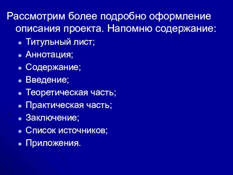Слайд 17Рассмотрим более подробно оформление описания проекта. Напомню содержание: