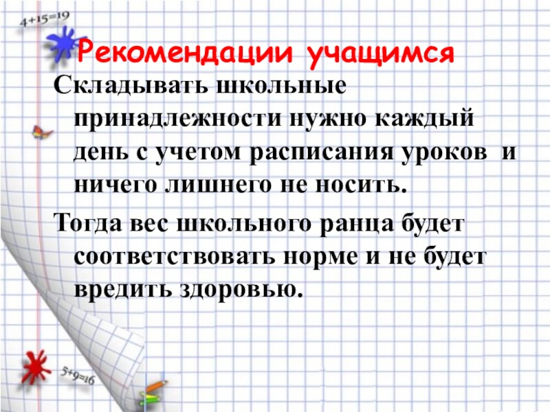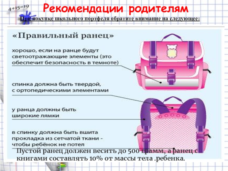 Вес ранца со всем содержимым не должен превышать: