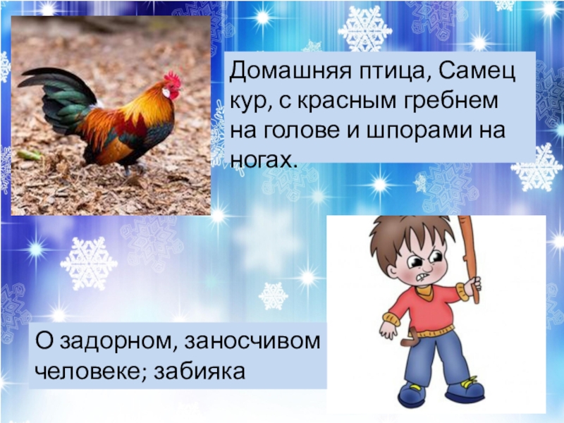 Домашняя птица, Самец кур, с красным гребнем на голове и шпорами на ногах.О задорном, заносчивом человеке; забияка