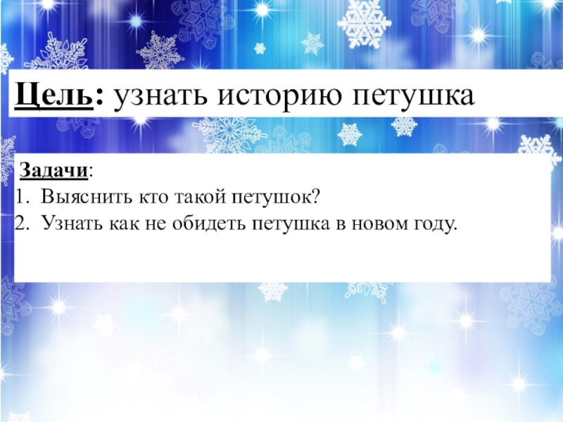 Цель: узнать историю петушкаЗадачи: Выяснить кто такой петушок? Узнать как не обидеть петушка в новом году.
