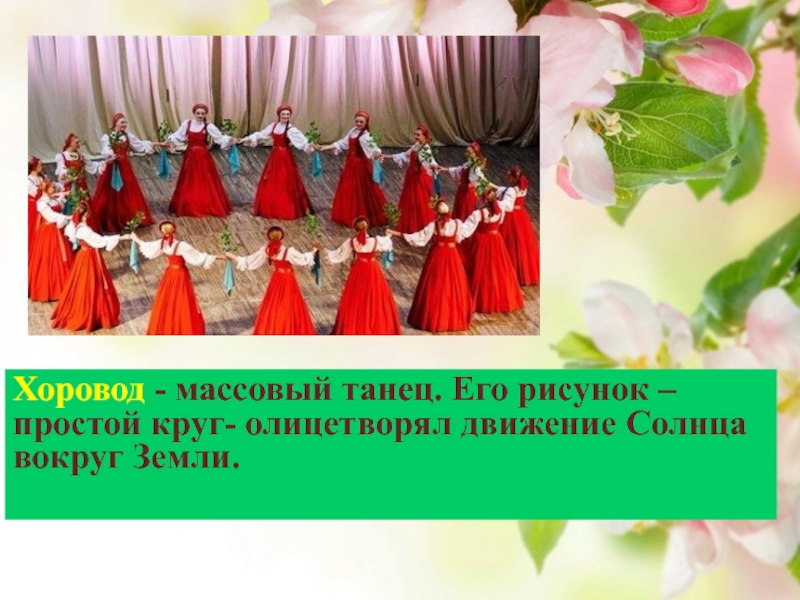 Хоровод - массовый танец. Его рисунок – простой круг- олицетворял движение Солнца вокруг Земли.
