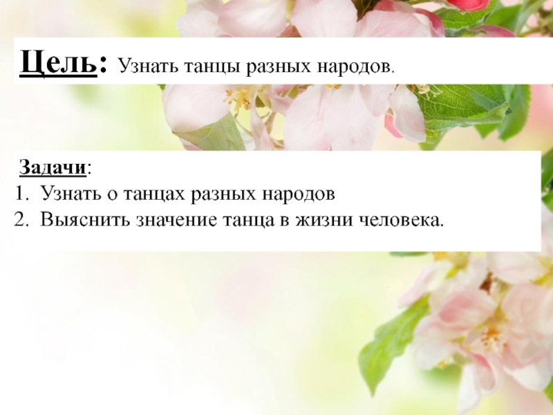 Цель: Узнать танцы разных народов.Задачи: Узнать о танцах разных народов Выяснить значение танца в жизни человека.