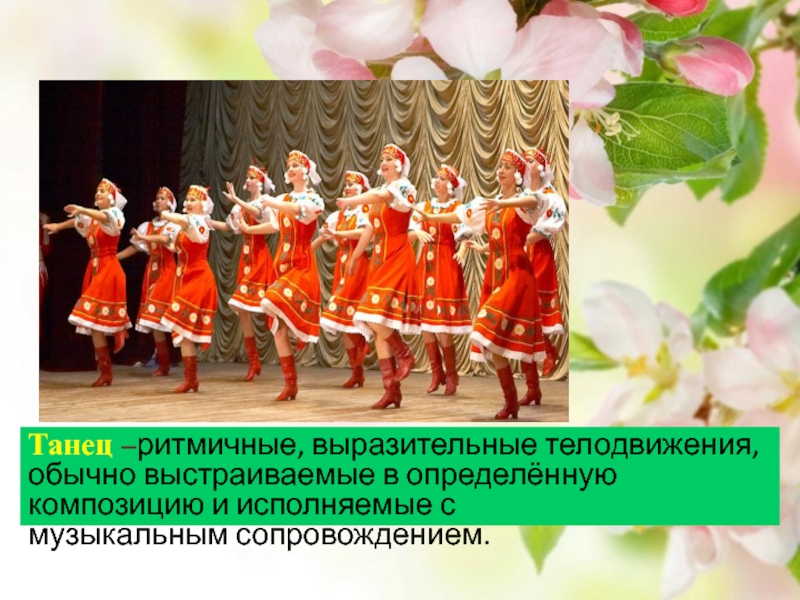 Танец –ритмичные, выразительные телодвижения, обычно выстраиваемые в определённую композицию и исполняемые