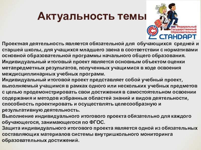Защита индивидуального итогового проекта является одной из обязательных составляющих материалов системы внутришкольного мониторинга образовательных достижений.