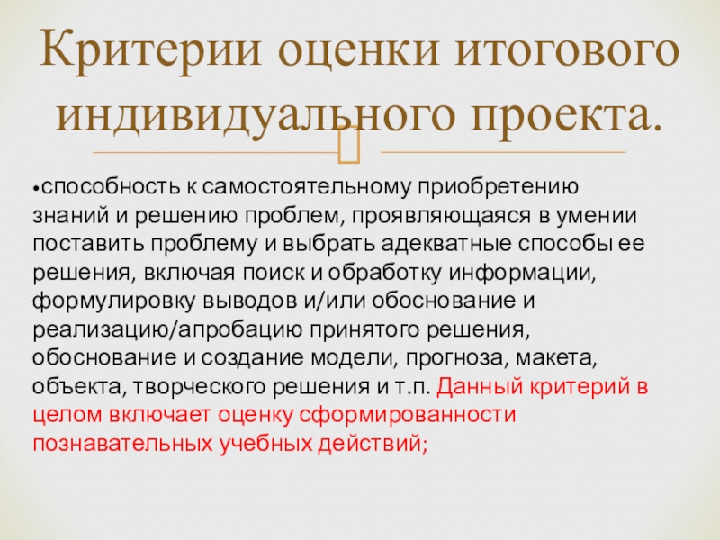Индивидуальный итоговый проект является основным объектом оценки метапредметных результатов, полученных учащимися в ходе освоения междисциплинарных учебных программ.