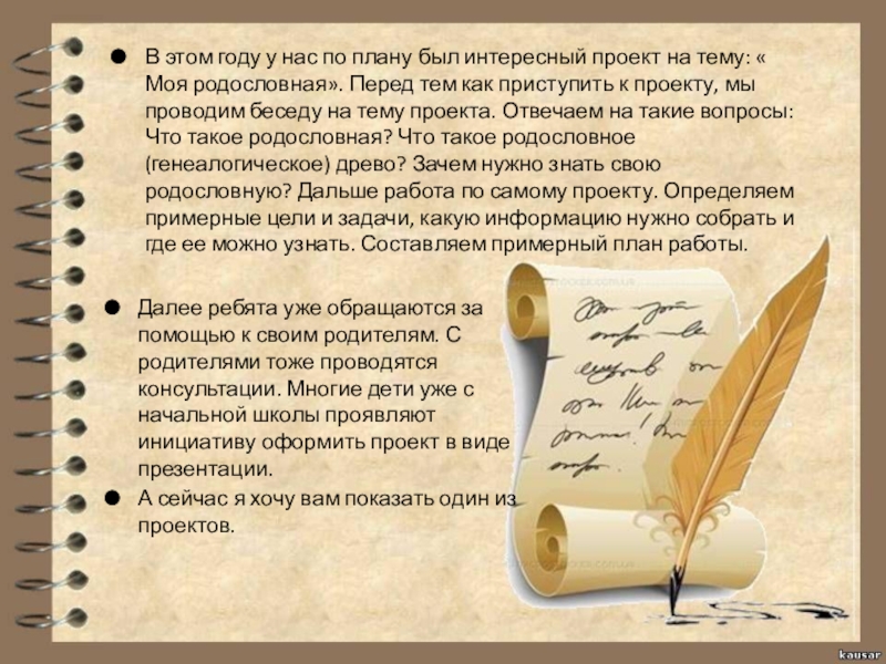 Далее ребята уже обращаются за помощью к своим родителям. С родителями тоже проводятся консультации. Многие дети уже с начальной школы проявляют инициативу оформить проект в виде презентации.
