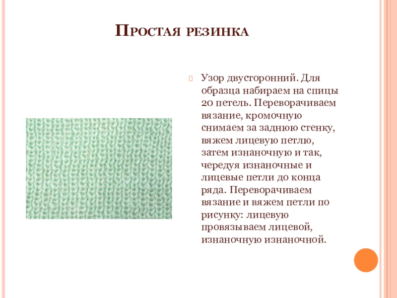 Узор двусторонний. Для образца набираем на спицы 20 петель. Переворачиваем