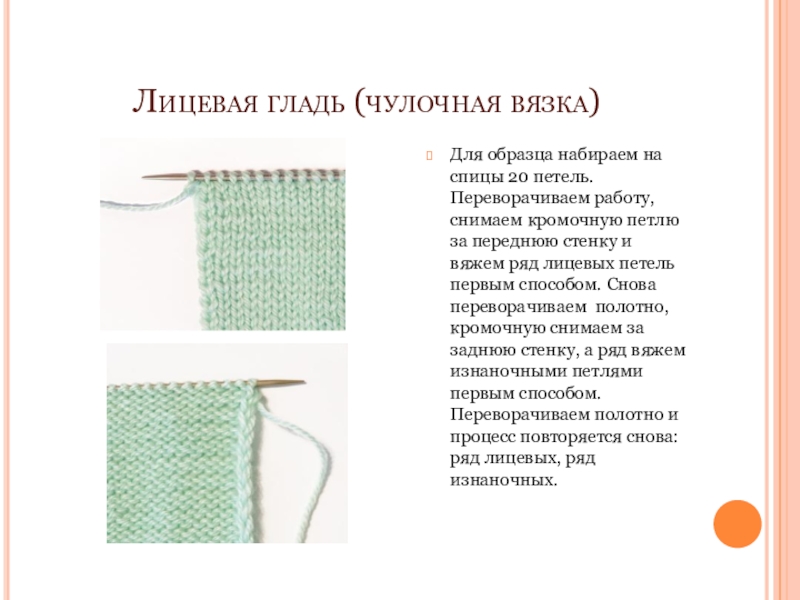 работу, снимаем кромочную петлю за переднюю стенку и вяжем ряд лицевых петель первым способом. Снова переворачиваем полотно, кромочную снимаем за заднюю стенку, а ряд вяжем изнаночными петлями первым способом. Переворачиваем полотно и процесс повторяется снова: ряд лицевых, ряд изнаночных.