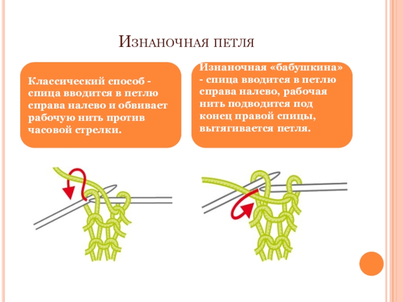 Изнаночная «бабушкина» - спица вводится в петлю справа налево, рабочая нить подводится под конец правой спицы, вытягивается петля.