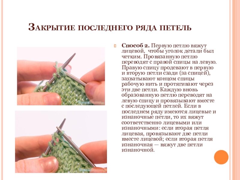 детали был четким. Провязанную петлю переводят с правой спицы на левую. Правую спицу продевают в первую и вторую петли сзади (за спицей), захватывают концом спицы рабочую нить и протягивают через эти две петли. Каждую вновь образованную петлю переводят на левую спицу и провязывают вместе с последующей петлей. Если в последнем ряду имеются лицевые и изнаночные петли, то их вяжут соответственно лицевыми или изнаночными: если вторая петля лицевая, провязывают две петли вместе лицевой; если вторая петля изнаночная — вяжут две петли изнаночной.