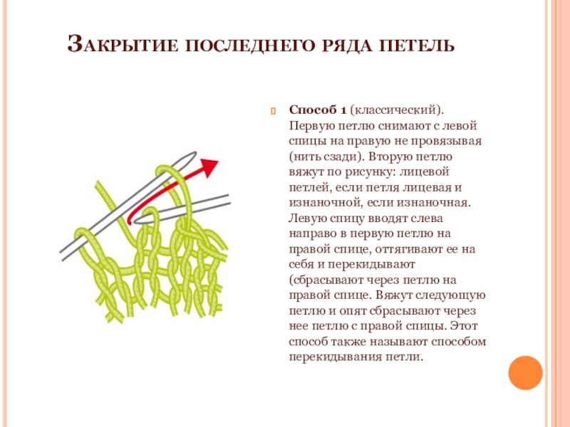 спицы на правую не провязывая (нить сзади). Вторую петлю вяжут по рисунку: лицевой петлей, если петля лицевая и изнаночной, если изнаночная. Левую спицу вводят слева направо в первую петлю на правой спице, оттягивают ее на себя и перекидывают (сбрасывают через петлю на правой спице. Вяжут следующую петлю и опят сбрасывают через нее петлю с правой спицы. Этот способ также называют способом перекидывания петли.