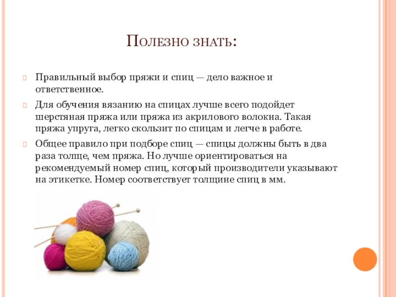 обучения вязанию на спицах лучше всего подойдет шерстяная пряжа или пряжа из акрилового волокна. Такая пряжа упруга, легко скользит по спицам и легче в работе.