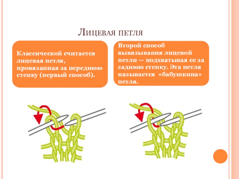 способ вывязывания лицевой петли — подхватывая ее за заднюю стенку. Эта петля называется «бабушкина» петля.