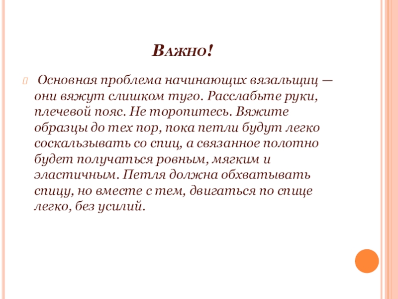 Основная проблема начинающих вязальщиц — они вяжут слишком туго. Расслабьте руки,