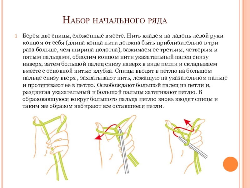 левой руки концом от себя (длина конца нити должна быть приблизительно в три раза больше, чем ширина полотна), зажимаем ее третьим, четверым и пятым пальцами, обводим концом нити указательный палец снизу наверх, затем большой палец снизу наверх в виде петли и складываем вместе с основной нитью клубка. Спицы вводят в петлю на большом пальце снизу вверх , захватывают нить, лежащую на указательном пальце и протягивают ее в петлю. Освобождают большой палец из петли и, раздвигая указательный и большой пальцы затягивают петлю. В образовавшуюся вокруг большого пальца петлю вновь вводят спицы и таким же образом набирают все оставшиеся петли.