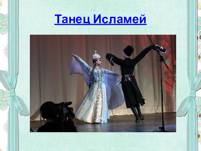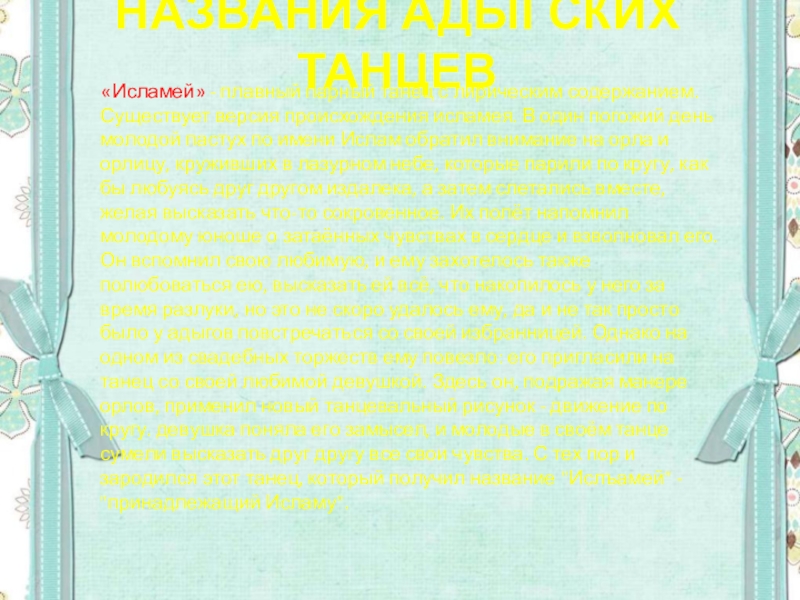 с лирическим содержанием. Существует версия происхождения исламея. В один погожий день молодой пастух по имени Ислам обратил внимание на орла и орлицу, круживших в лазурном небе, которые парили по кругу, как бы любуясь друг другом издалека, а затем слетались вместе, желая высказать что-то сокровенное. Их полёт напомнил молодому юноше о затаённых чувствах в сердце и взволновал его. Он вспомнил свою любимую, и ему захотелось также полюбоваться ею, высказать ей всё, что накопилось у него за время разлуки, но это не скоро удалось ему, да и не так просто было у адыгов повстречаться со своей избранницей. Однако на одном из свадебных торжеств ему повезло: его пригласили на танец со своей любимой девушкой. Здесь он, подражая манере орлов, применил новый танцевальный рисунок - движение по кругу. девушка поняла его замысел, и молодые в своём танце сумели высказать друг другу все свои чувства. С тех пор и зародился этот танец, который получил название "Ислъамей" - "принадлежащий Исламу".