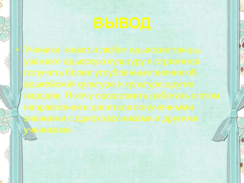 получить более углубленные знания об адыгейской культуре и культуре других народов. Я хочу продолжить работать в этом направлении и делиться полученными знаниями с одноклассниками и другими учениками.
