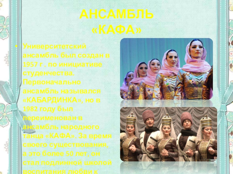 Первоначально ансамбль назывался «КАБАРДИНКА», но в 1982 году был переименован в ансамбль народного танца «КАФА». За время своего существования, а это более 50 лет, он стал подлинной школой воспитания любви к культуре, народной хореографии.