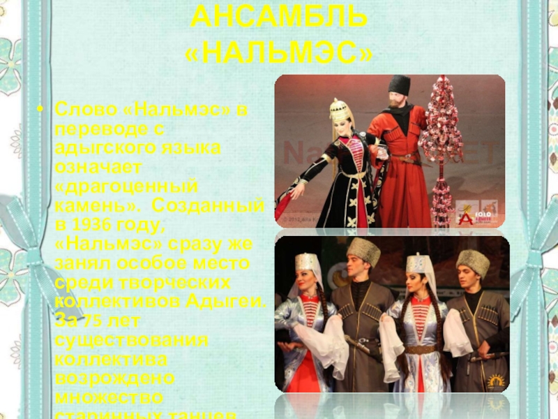 в 1936 году, «Нальмэс» сразу же занял особое место среди творческих коллективов Адыгеи. За 75 лет существования коллектива возрождено множество старинных танцев.