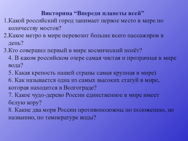 Викторина “Впереди планеты всей”Какой российский город занимает первое место в мире по количеству мостов? Какое метро в