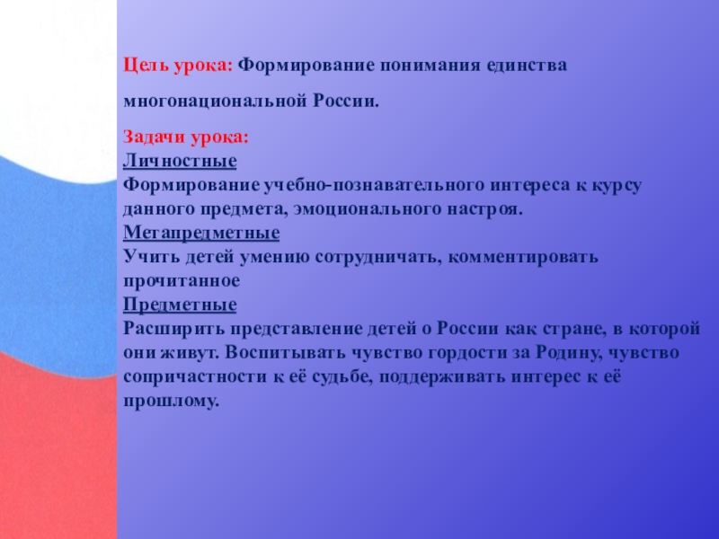 Цель урока: Формирование понимания единства многонациональной России.Задачи урока:ЛичностныеФормирование учебно-познавательного интереса к курсу данного предмета, эмоционального настроя.МетапредметныеУчить детей
