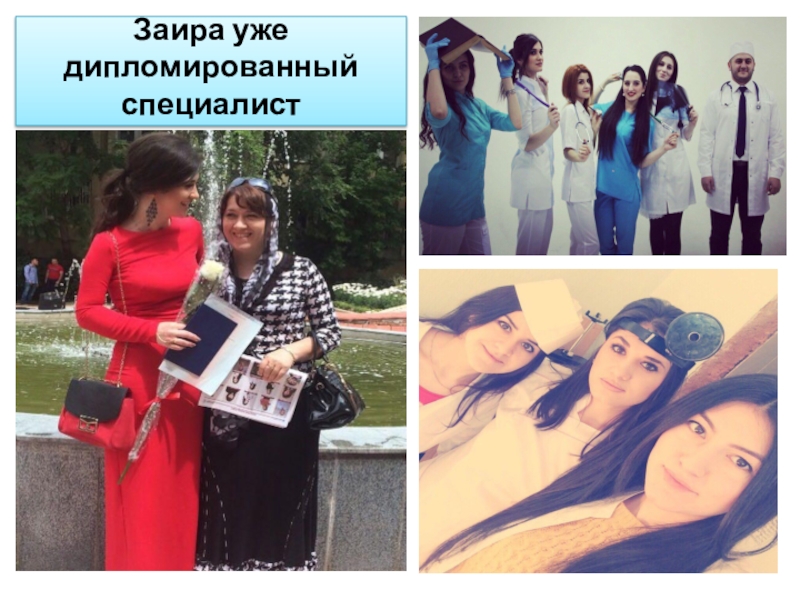 даже сдала документы в институт МВД и по убедительной просьбе родственников параллельно сдала документы и в медицинскую Академию города Астрахани. Она была зачислена в оба учебные заведения , и всё же смогли переубедить Заиру , что для девушки лучше профессия медика. Данное время она проходит интернатуру и работает педиатром в Александро-Марьийской больнице.