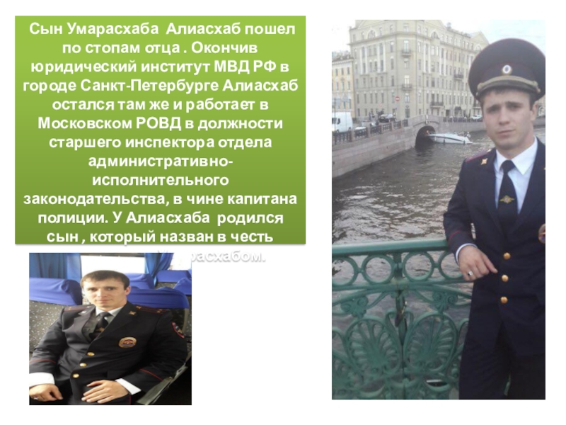 институт МВД РФ в городе Санкт-Петербурге Алиасхаб остался там же и работает в Московском РОВД в должности старшего инспектора отдела административно-исполнительного законодательства, в чине капитана полиции. У Алиасхаба родился сын , который назван в честь своего отца –Умарасхабом.