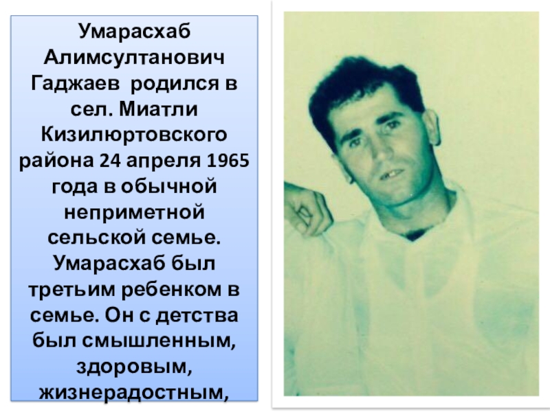 Слайд 4Умарасхаб Алимсултанович Гаджаев родился в сел. Миатли Кизилюртовского района 24