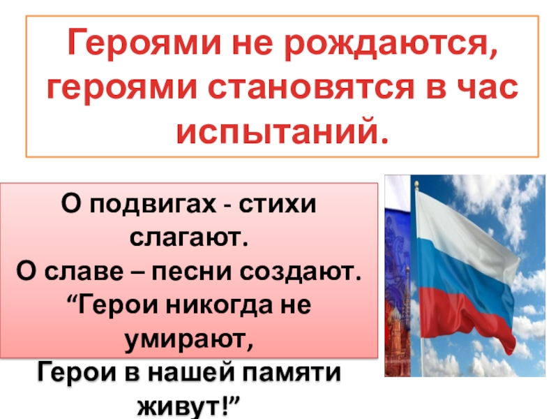 Героями не рождаются, героями становятся в час испытаний.О подвигах - стихи слагают. О славе – песни создают.