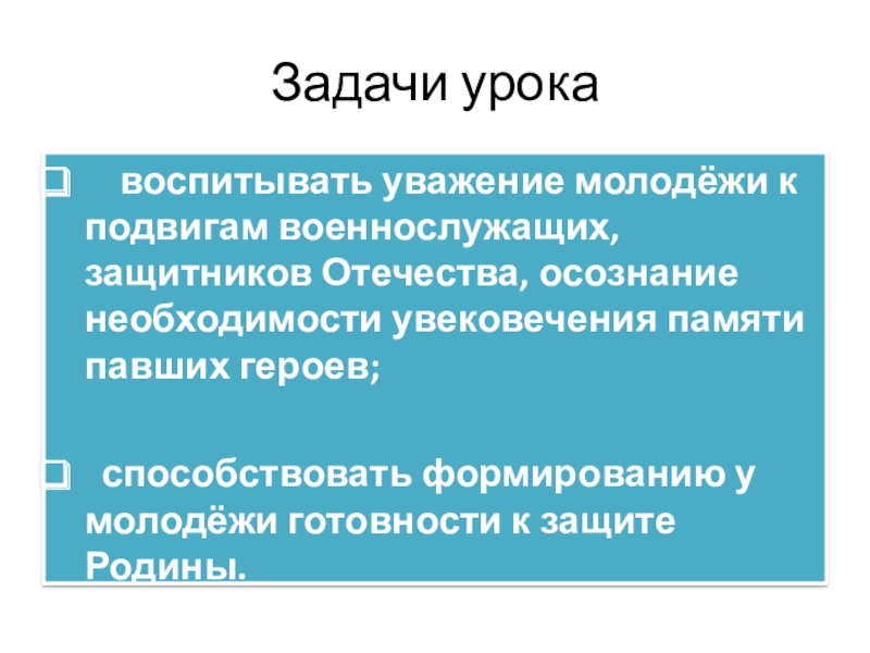Задачи урока   воспитывать уважение молодёжи к подвигам военнослужащих, защитников Отечества, осознание необходимости увековечения памяти павших