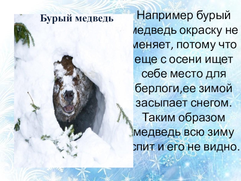 Слайд 8Например бурый медведь окраску не меняет, потому что еще с осени