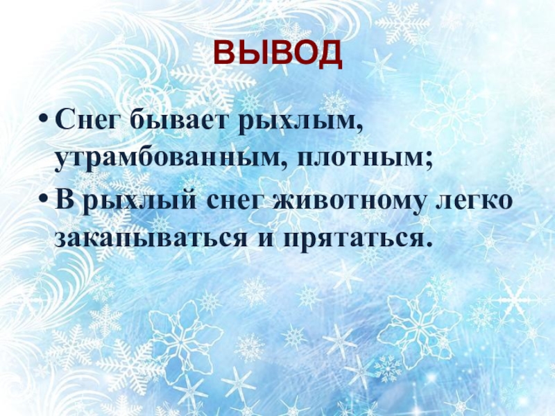 Свойства снега оказывают большое влияние на жизнь животного зимой.