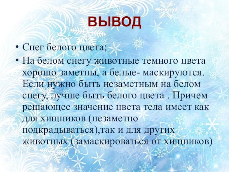 белые- маскируются. Если нужно быть незаметным на белом снегу, лучше быть белого цвета . Причем решающее значение цвета тела имеет как для хищников (незаметно подкрадываться),так и для других животных (замаскироваться от хищников)