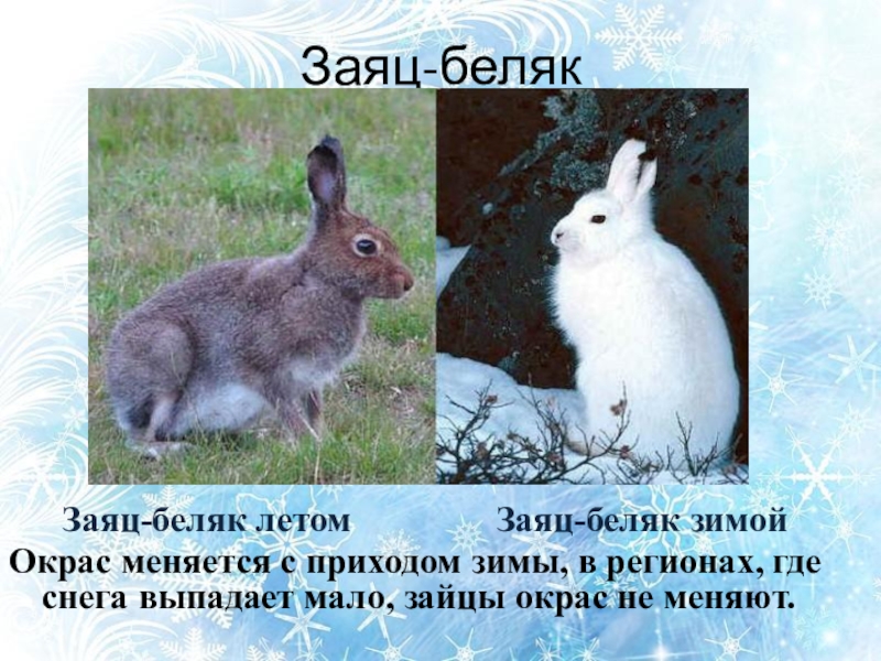 Окрас меняется с приходом зимы, в регионах, где снега выпадает мало, зайцы окрас не меняют.