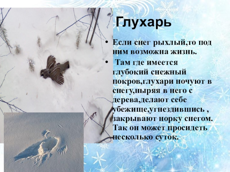 Там где имеется глубокий снежный покров,глухари ночуют в снегу,ныряя в него с дерева,делают себе убежище,угнездившись ,закрывают норку снегом. Так он может просидеть несколько суток.